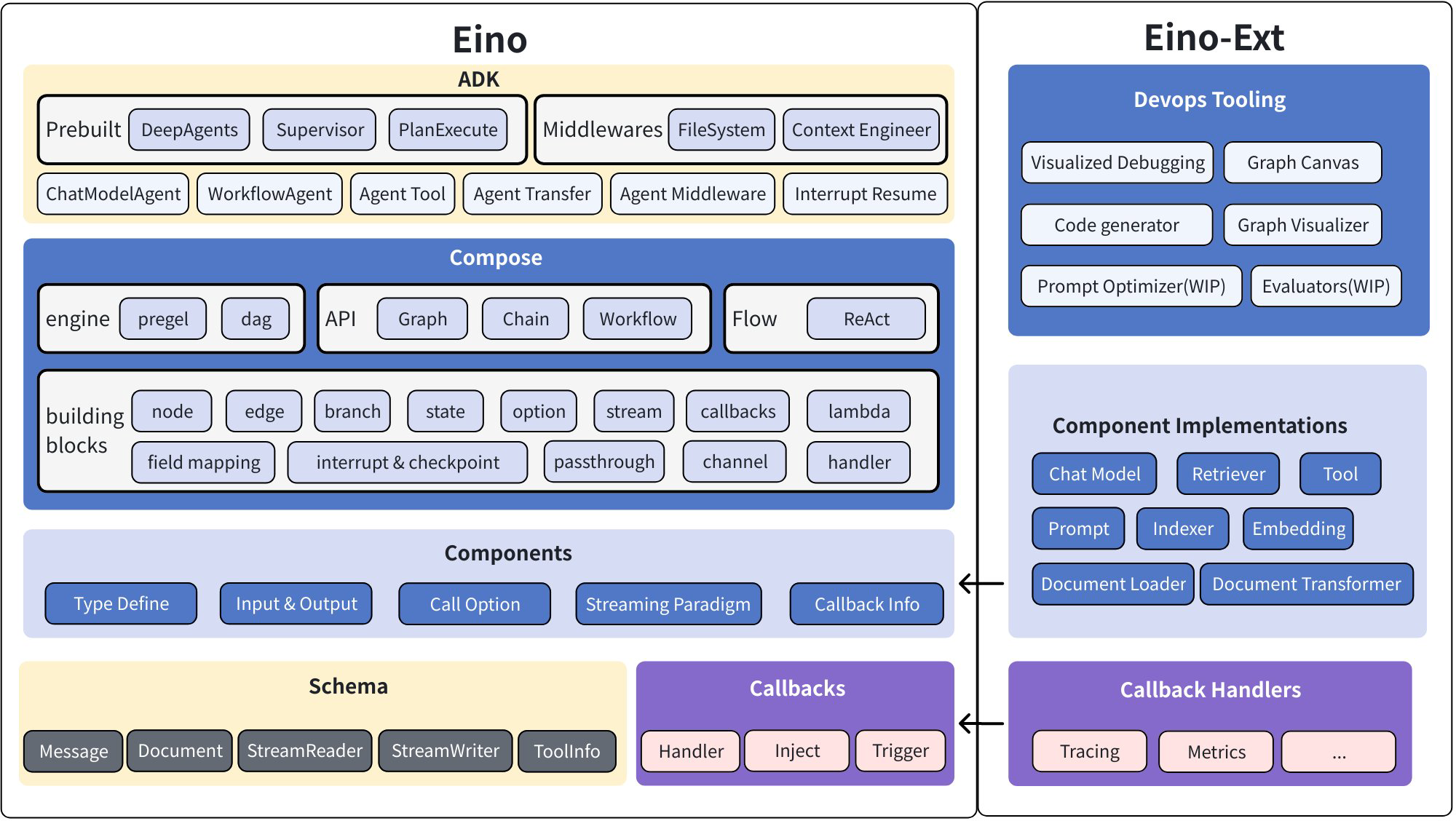 - Eino: Contains type definitions, stream data processing mechanisms, component abstraction definitions, orchestration functionality, callback mechanisms, etc.